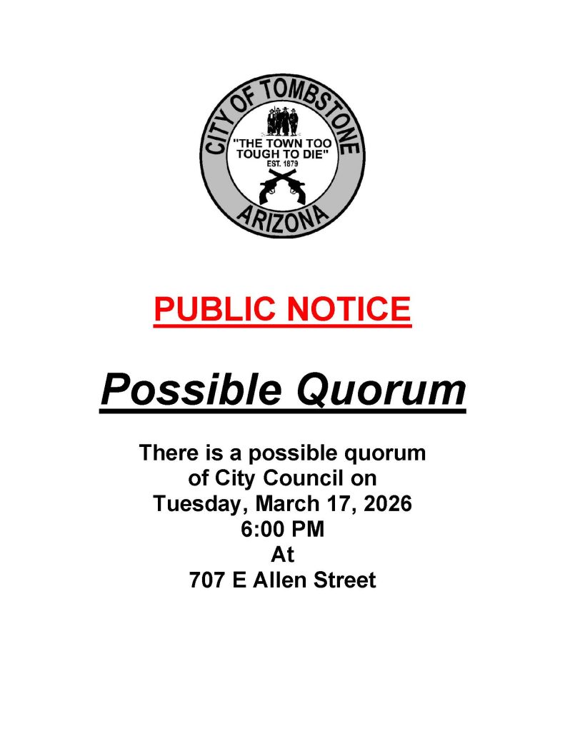 Posted on February 27, 2026, Edited February 27, 2026 by city secretary Possible Quorum of City Council 3/17/2024 Tuesday, March 17, 2026, 6:00 PM At 707 E Allen Street, Tombstone, AZ