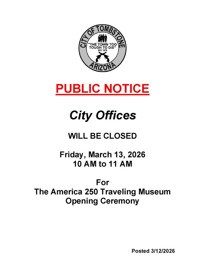 City offices including, City Hall, Public Works, Tombstone Marshal, and Library will be closed between 10 AM and 11 AM, so employees can attend the opening ceremony for the America 250 Traveling Museum.