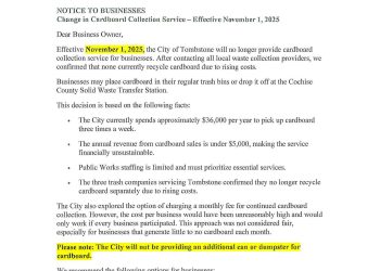 Effective November 1, 2025, the City of Tombstone will no longer provide cardboardcollection service for…